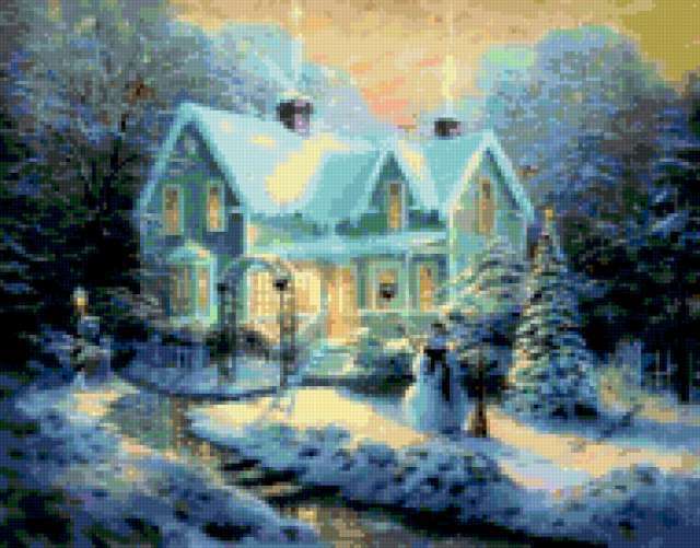 Ориентировочно так, схема вышивки «349», созданная автором Valkiriya, будет выглядеть при отшиве на канве. Размер данной вышивки равен 190x149 крестов, при этом используется 74 цветов. Ключевые слова, по которым можно найти эту схему: рождество, дом, пейзаж, зима. Также, вы можете взглянуть на оригинальную картинку, соответствующую данной схеме вышивки.