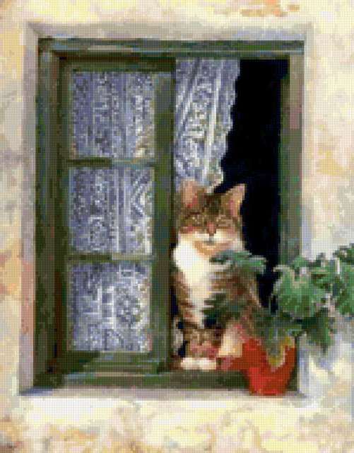 Ориентировочно так, схема вышивки «353», созданная автором Valkiriya, будет выглядеть при отшиве на канве. Размер данной вышивки равен 149x190 крестов, при этом используется 74 цветов. Ключевые слова, по которым можно найти эту схему: кошка, кот, животные. Также, вы можете взглянуть на оригинальную картинку, соответствующую данной схеме вышивки.