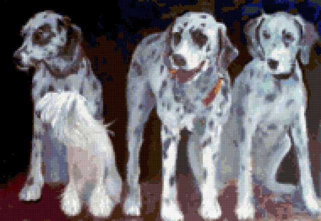 Ориентировочно так, схема вышивки «390», созданная автором Valkiriya, будет выглядеть при отшиве на канве. Размер данной вышивки равен 190x131 крестов, при этом используется 59 цветов. Ключевые слова, по которым можно найти эту схему: собаки, далматинцы, животные, живопись. Также, вы можете взглянуть на оригинальную картинку, соответствующую данной схеме вышивки.