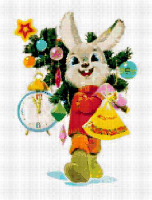 Ориентировочно так, схема вышивки «41989», созданная автором irenidanna, будет выглядеть при отшиве на канве. Размер данной вышивки равен 145x190 крестов, при этом используется 59 цветов. Ключевые слова, по которым можно найти эту схему: зайка, детям, новый год. Также, вы можете взглянуть на оригинальную картинку, соответствующую данной схеме вышивки.