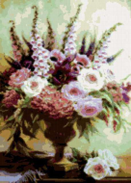 Ориентировочно так, схема вышивки «436», созданная автором irenidanna, будет выглядеть при отшиве на канве. Размер данной вышивки равен 136x190 крестов, при этом используется 46 цветов. Ключевые слова, по которым можно найти эту схему: цветы, ваза, букет. Также, вы можете взглянуть на оригинальную картинку, соответствующую данной схеме вышивки.