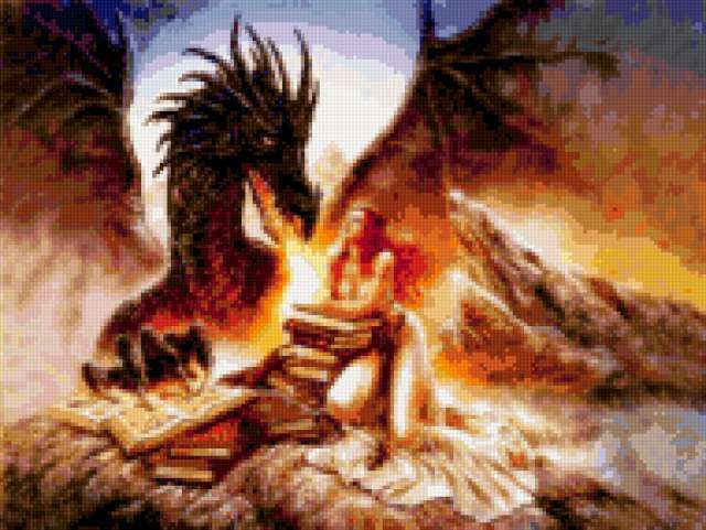 Ориентировочно так, схема вышивки «449», созданная автором Valkiriya, будет выглядеть при отшиве на канве. Размер данной вышивки равен 190x143 крестов, при этом используется 81 цветов. Ключевые слова, по которым можно найти эту схему: дракон, девушка, фэнтези. Также, вы можете взглянуть на оригинальную картинку, соответствующую данной схеме вышивки.