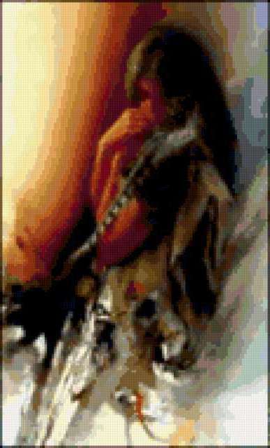 Ориентировочно так, схема вышивки «45», созданная автором girasole, будет выглядеть при отшиве на канве. Размер данной вышивки равен 115x190 крестов, при этом используется 64 цветов. Ключевые слова, по которым можно найти эту схему: индейцы. Также, вы можете взглянуть на оригинальную картинку, соответствующую данной схеме вышивки.