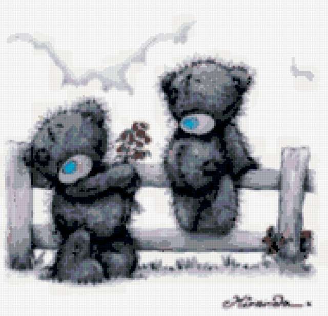 Ориентировочно так, схема вышивки «4587», созданная автором irenidanna, будет выглядеть при отшиве на канве. Размер данной вышивки равен 190x183 крестов, при этом используется 25 цветов. Ключевые слова, по которым можно найти эту схему: мишки, тедди. Также, вы можете взглянуть на оригинальную картинку, соответствующую данной схеме вышивки.