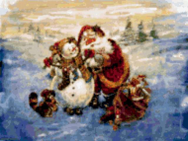 Ориентировочно так, схема вышивки «522», созданная автором Valkiriya, будет выглядеть при отшиве на канве. Размер данной вышивки равен 190x143 крестов, при этом используется 79 цветов. Ключевые слова, по которым можно найти эту схему: дед мороз, снеговик, зима, новый год. Также, вы можете взглянуть на оригинальную картинку, соответствующую данной схеме вышивки.