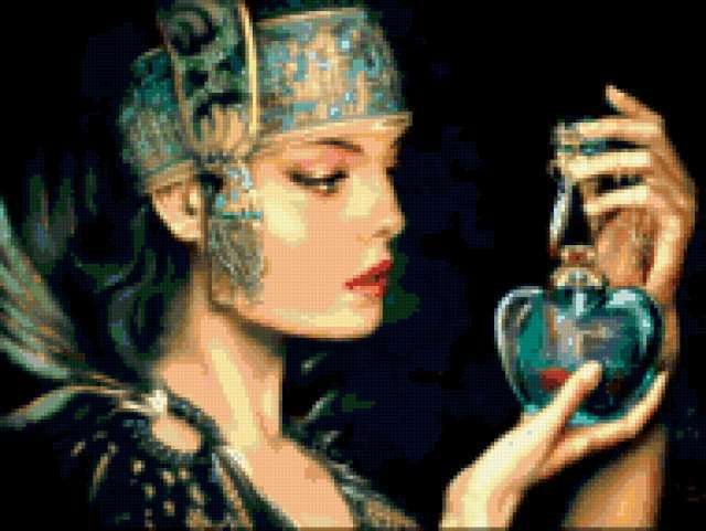Ориентировочно так, схема вышивки «533», созданная автором Valkiriya, будет выглядеть при отшиве на канве. Размер данной вышивки равен 190x143 крестов, при этом используется 67 цветов. Ключевые слова, по которым можно найти эту схему: девушка, духи. Также, вы можете взглянуть на оригинальную картинку, соответствующую данной схеме вышивки.