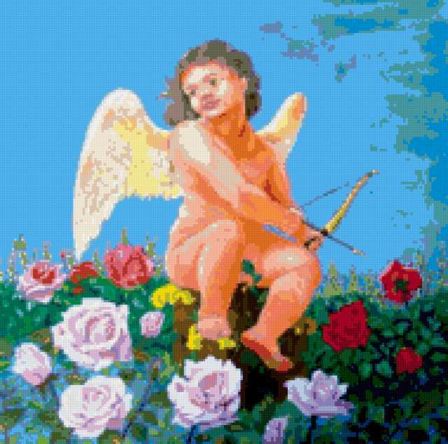 Ориентировочно так, схема вышивки «5418498», созданная автором irenidanna, будет выглядеть при отшиве на канве. Размер данной вышивки равен 190x188 крестов, при этом используется 75 цветов. Ключевые слова, по которым можно найти эту схему: амурчик, цветы. Также, вы можете взглянуть на оригинальную картинку, соответствующую данной схеме вышивки.