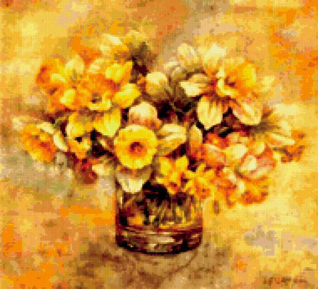 Ориентировочно так, схема вышивки «546446», созданная автором irenidanna, будет выглядеть при отшиве на канве. Размер данной вышивки равен 190x173 крестов, при этом используется 62 цветов. Ключевые слова, по которым можно найти эту схему: цветы. букет, нарциссы. Также, вы можете взглянуть на оригинальную картинку, соответствующую данной схеме вышивки.