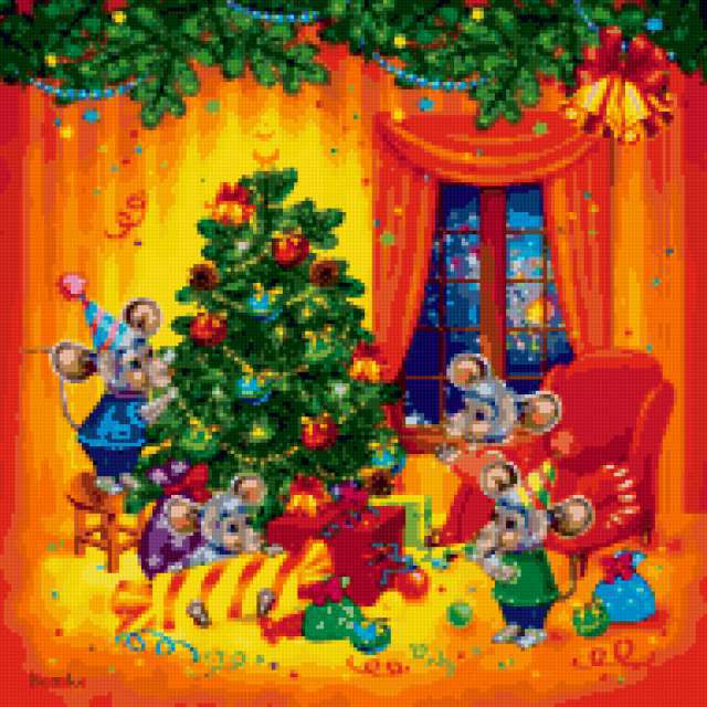 Ориентировочно так, схема вышивки «5498», созданная автором irenidanna, будет выглядеть при отшиве на канве. Размер данной вышивки равен 190x190 крестов, при этом используется 64 цветов. Ключевые слова, по которым можно найти эту схему: новый год. Также, вы можете взглянуть на оригинальную картинку, соответствующую данной схеме вышивки.