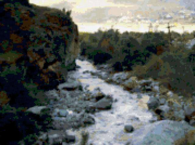 Ориентировочно так, схема вышивки «565722», созданная автором lovelife, будет выглядеть при отшиве на канве. Размер данной вышивки равен 179x134 крестов, при этом используется 57 цветов. Ключевые слова, по которым можно найти эту схему: река, вода. Также, вы можете взглянуть на оригинальную картинку, соответствующую данной схеме вышивки.