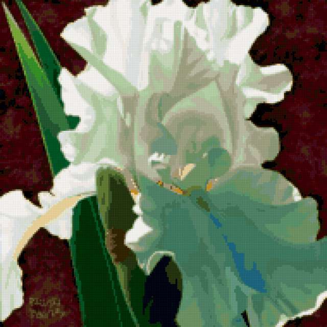 Ориентировочно так, схема вышивки «654688», созданная автором irenidanna, будет выглядеть при отшиве на канве. Размер данной вышивки равен 190x190 крестов, при этом используется 45 цветов. Ключевые слова, по которым можно найти эту схему: цветок, ирис. Также, вы можете взглянуть на оригинальную картинку, соответствующую данной схеме вышивки.