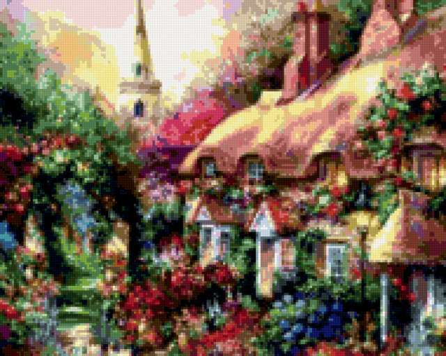 Ориентировочно так, схема вышивки «6565», созданная автором irenidanna, будет выглядеть при отшиве на канве. Размер данной вышивки равен 190x152 крестов, при этом используется 56 цветов. Ключевые слова, по которым можно найти эту схему: сказка, дом, фентези, цветы. Также, вы можете взглянуть на оригинальную картинку, соответствующую данной схеме вышивки.