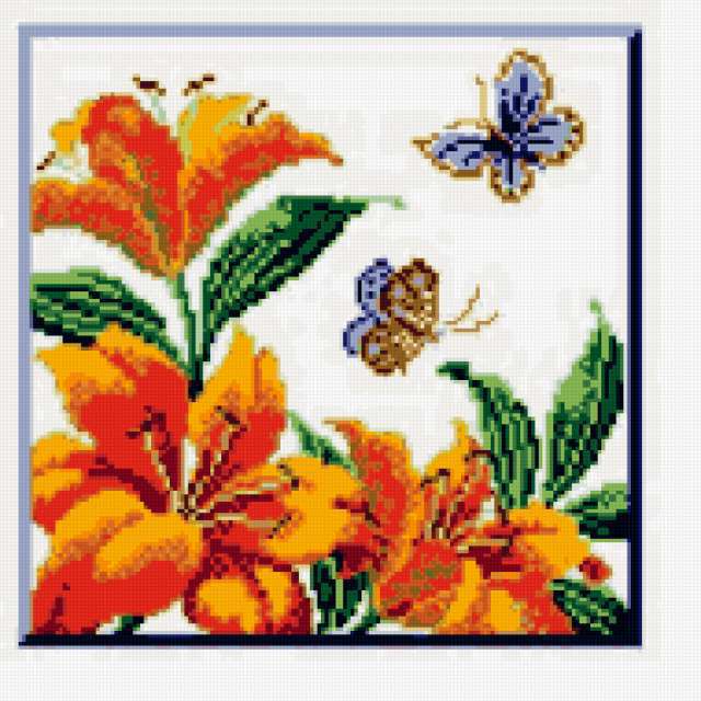 Ориентировочно так, схема вышивки «6572», созданная автором irenidanna, будет выглядеть при отшиве на канве. Размер данной вышивки равен 190x190 крестов, при этом используется 32 цветов. Ключевые слова, по которым можно найти эту схему: подушка, цветы, лилии, бабочки. Также, вы можете взглянуть на оригинальную картинку, соответствующую данной схеме вышивки.
