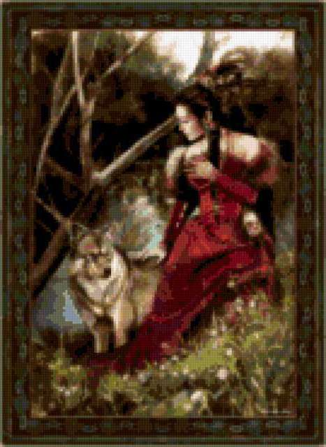 Ориентировочно так, схема вышивки «6580», созданная автором anastasia896, будет выглядеть при отшиве на канве. Размер данной вышивки равен 135x185 крестов, при этом используется 47 цветов. Ключевые слова, по которым можно найти эту схему: девушка, животные, волк. Также, вы можете взглянуть на оригинальную картинку, соответствующую данной схеме вышивки.