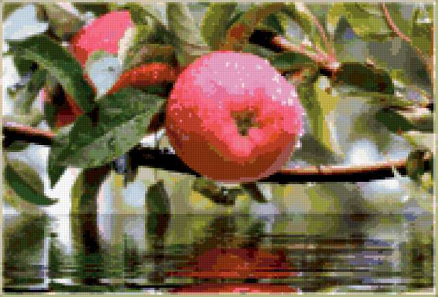Ориентировочно так, схема вышивки «71», созданная автором ostrovok_a, будет выглядеть при отшиве на канве. Размер данной вышивки равен 190x129 крестов, при этом используется 80 цветов. Ключевые слова, по которым можно найти эту схему: яблоко, вода. Также, вы можете взглянуть на оригинальную картинку, соответствующую данной схеме вышивки.