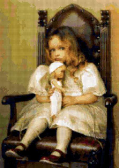 Ориентировочно так, схема вышивки «742», созданная автором Valkiriya, будет выглядеть при отшиве на канве. Размер данной вышивки равен 135x190 крестов, при этом используется 67 цветов. Ключевые слова, по которым можно найти эту схему: девочка, дети, кукла, картина. Также, вы можете взглянуть на оригинальную картинку, соответствующую данной схеме вышивки.