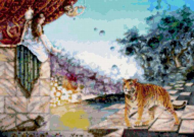 Ориентировочно так, схема вышивки «7694», созданная автором anastasia896, будет выглядеть при отшиве на канве. Размер данной вышивки равен 190x135 крестов, при этом используется 86 цветов. Ключевые слова, по которым можно найти эту схему: животные, кошки, девушка. Также, вы можете взглянуть на оригинальную картинку, соответствующую данной схеме вышивки.