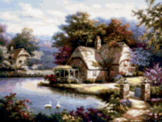 Ориентировочно так, схема вышивки «781», созданная автором Valkiriya, будет выглядеть при отшиве на канве. Размер данной вышивки равен 190x144 крестов, при этом используется 84 цветов. Ключевые слова, по которым можно найти эту схему: пейзаж, природа, домик, пруд, лебеди, вода, цветы, деревья, живопись. Также, вы можете взглянуть на оригинальную картинку, соответствующую данной схеме вышивки.