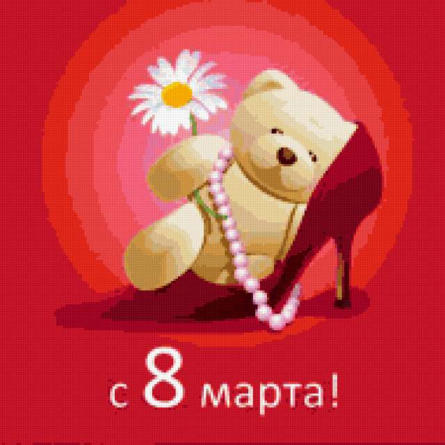 Ориентировочно так, схема вышивки «8 Марта», созданная автором vesnyshka63, будет выглядеть при отшиве на канве. Размер данной вышивки равен 190x190 крестов, при этом используется 54 цветов. Ключевые слова, по которым можно найти эту схему: открытка, цветы, медвеженок, бусы, туфли. Также, вы можете взглянуть на оригинальную картинку, соответствующую данной схеме вышивки.