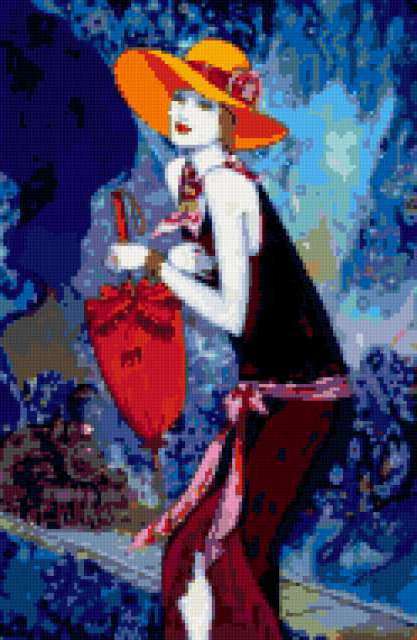 Ориентировочно так, схема вышивки «8», созданная автором ze79, будет выглядеть при отшиве на канве. Размер данной вышивки равен 124x190 крестов, при этом используется 48 цветов. Ключевые слова, по которым можно найти эту схему: девушка, женщина, люди, ретро. Также, вы можете взглянуть на оригинальную картинку, соответствующую данной схеме вышивки.