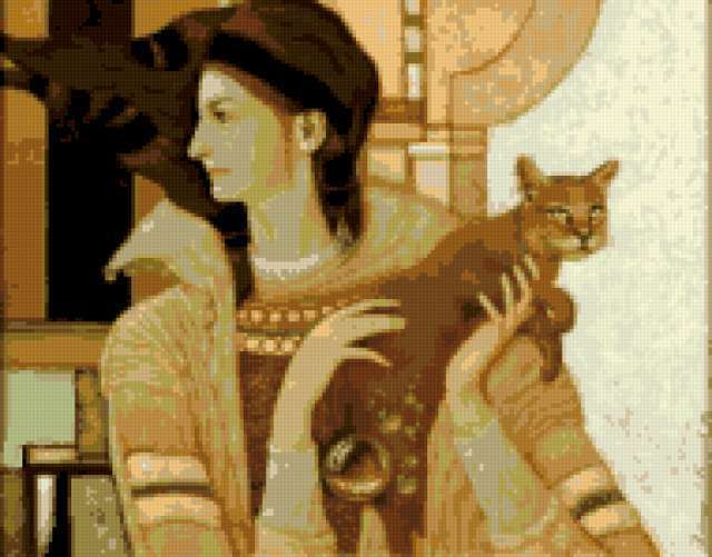 Ориентировочно так, схема вышивки «8149849», созданная автором irenidanna, будет выглядеть при отшиве на канве. Размер данной вышивки равен 190x149 крестов, при этом используется 30 цветов. Ключевые слова, по которым можно найти эту схему: женщина, кошка. Также, вы можете взглянуть на оригинальную картинку, соответствующую данной схеме вышивки.