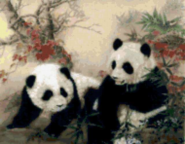 Ориентировочно так, схема вышивки «862», созданная автором Valkiriya, будет выглядеть при отшиве на канве. Размер данной вышивки равен 190x148 крестов, при этом используется 71 цветов. Ключевые слова, по которым можно найти эту схему: панда, животные, китайская живопись. Также, вы можете взглянуть на оригинальную картинку, соответствующую данной схеме вышивки.