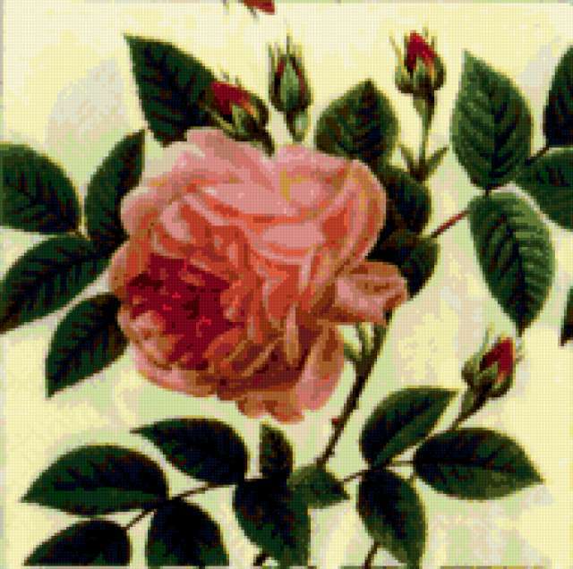 Ориентировочно так, схема вышивки «8676», созданная автором irenidanna, будет выглядеть при отшиве на канве. Размер данной вышивки равен 190x189 крестов, при этом используется 49 цветов. Ключевые слова, по которым можно найти эту схему: подушка, цветок, роза. Также, вы можете взглянуть на оригинальную картинку, соответствующую данной схеме вышивки.