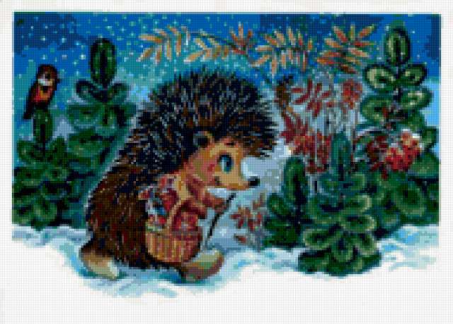 Ориентировочно так, схема вышивки «891849», созданная автором irenidanna, будет выглядеть при отшиве на канве. Размер данной вышивки равен 190x136 крестов, при этом используется 49 цветов. Ключевые слова, по которым можно найти эту схему: зима, сказка, ежик, детям. Также, вы можете взглянуть на оригинальную картинку, соответствующую данной схеме вышивки.
