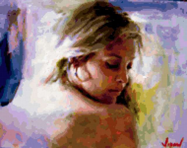 Ориентировочно так, схема вышивки «9», созданная автором tina1983, будет выглядеть при отшиве на канве. Размер данной вышивки равен 190x150 крестов, при этом используется 79 цветов. Ключевые слова, по которым можно найти эту схему: девушка, картина. Также, вы можете взглянуть на оригинальную картинку, соответствующую данной схеме вышивки.