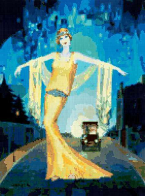 Ориентировочно так, схема вышивки «9», созданная автором ze79, будет выглядеть при отшиве на канве. Размер данной вышивки равен 141x190 крестов, при этом используется 41 цветов. Ключевые слова, по которым можно найти эту схему: девушка, женщина, люди, ретро. Также, вы можете взглянуть на оригинальную картинку, соответствующую данной схеме вышивки.
