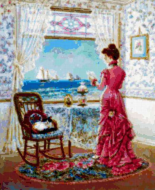 Ориентировочно так, схема вышивки «929», созданная автором Valkiriya, будет выглядеть при отшиве на канве. Размер данной вышивки равен 155x190 крестов, при этом используется 80 цветов. Ключевые слова, по которым можно найти эту схему: девушка, парусник, море, пейзаж, кошка. Также, вы можете взглянуть на оригинальную картинку, соответствующую данной схеме вышивки.