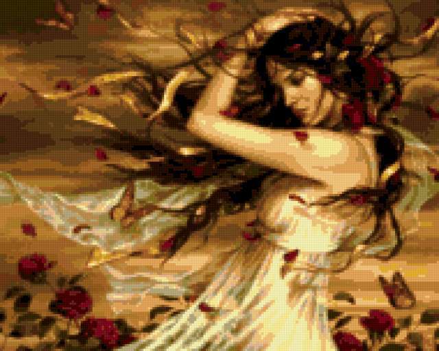 Ориентировочно так, схема вышивки «93673», созданная автором irenidanna, будет выглядеть при отшиве на канве. Размер данной вышивки равен 190x152 крестов, при этом используется 33 цветов. Ключевые слова, по которым можно найти эту схему: девушка, ветер, цветы, листья. Также, вы можете взглянуть на оригинальную картинку, соответствующую данной схеме вышивки.