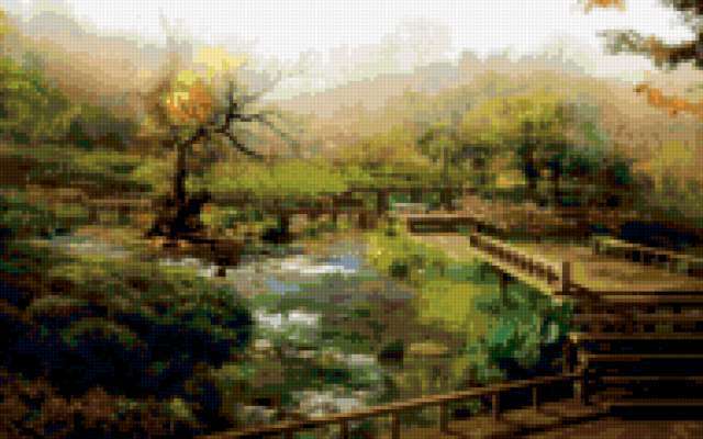 Ориентировочно так, схема вышивки «943», созданная автором Valkiriya, будет выглядеть при отшиве на канве. Размер данной вышивки равен 190x119 крестов, при этом используется 71 цветов. Ключевые слова, по которым можно найти эту схему: природа, деревья, вода, пейзаж. Также, вы можете взглянуть на оригинальную картинку, соответствующую данной схеме вышивки.