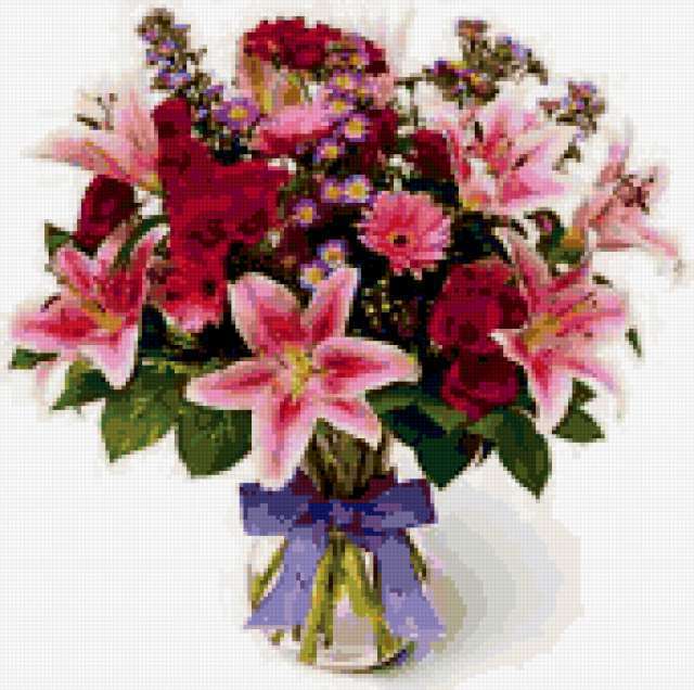 Ориентировочно так, схема вышивки «947», созданная автором Valkiriya, будет выглядеть при отшиве на канве. Размер данной вышивки равен 171x170 крестов, при этом используется 80 цветов. Ключевые слова, по которым можно найти эту схему: букет, цветы. Также, вы можете взглянуть на оригинальную картинку, соответствующую данной схеме вышивки.