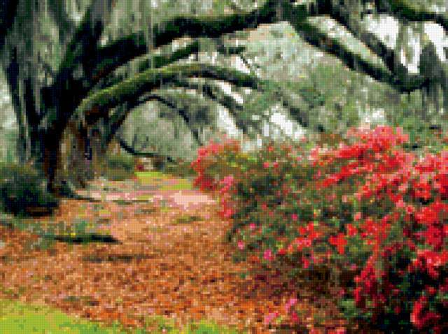 Ориентировочно так, схема вышивки «951», созданная автором Valkiriya, будет выглядеть при отшиве на канве. Размер данной вышивки равен 190x142 крестов, при этом используется 82 цветов. Ключевые слова, по которым можно найти эту схему: парк, деревья, цветы, природа, пейзаж, осень. Также, вы можете взглянуть на оригинальную картинку, соответствующую данной схеме вышивки.
