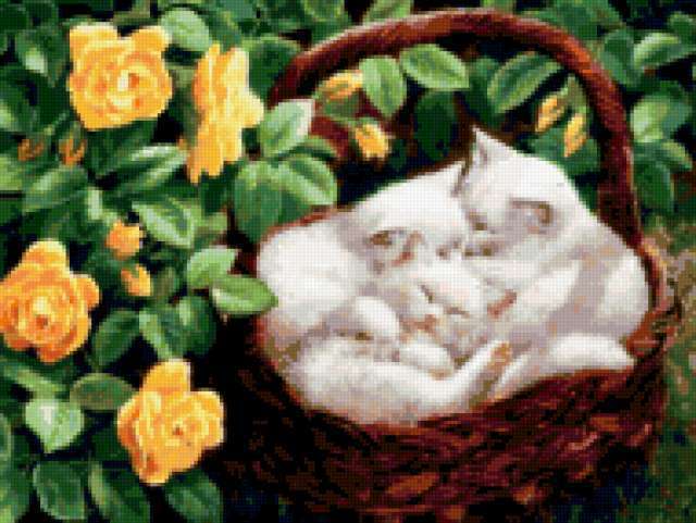 Ориентировочно так, схема вышивки «952», созданная автором Valkiriya, будет выглядеть при отшиве на канве. Размер данной вышивки равен 190x143 крестов, при этом используется 77 цветов. Ключевые слова, по которым можно найти эту схему: котята, кошка, цветы, животные, живопись. Также, вы можете взглянуть на оригинальную картинку, соответствующую данной схеме вышивки.