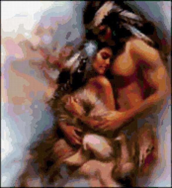Ориентировочно так, схема вышивки «960», созданная автором girasole, будет выглядеть при отшиве на канве. Размер данной вышивки равен 174x190 крестов, при этом используется 70 цветов. Ключевые слова, по которым можно найти эту схему: индейцы. Также, вы можете взглянуть на оригинальную картинку, соответствующую данной схеме вышивки.