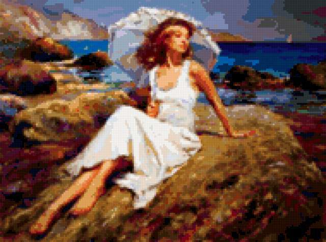 Ориентировочно так, схема вышивки «964», созданная автором Valkiriya, будет выглядеть при отшиве на канве. Размер данной вышивки равен 190x141 крестов, при этом используется 76 цветов. Ключевые слова, по которым можно найти эту схему: девушка, зонтик, море, картина, живопись. Также, вы можете взглянуть на оригинальную картинку, соответствующую данной схеме вышивки.