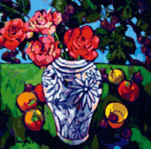 Ориентировочно так, схема вышивки «A Gathering», созданная автором pandreevska, будет выглядеть при отшиве на канве. Размер данной вышивки равен 190x187 крестов, при этом используется 53 цветов. Ключевые слова, по которым можно найти эту схему: Jae Dougall, still life, натюрморт, flowers, colorful, bright. Также, вы можете взглянуть на оригинальную картинку, соответствующую данной схеме вышивки.