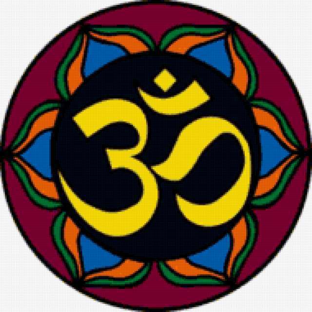 Ориентировочно так, схема вышивки «AUM6», созданная автором olenkap83, будет выглядеть при отшиве на канве. Размер данной вышивки равен 190x190 крестов, при этом используется 47 цветов. Ключевые слова, по которым можно найти эту схему: религия. Также, вы можете взглянуть на оригинальную картинку, соответствующую данной схеме вышивки.