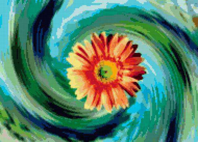 Ориентировочно так, схема вышивки «Abstract Flower», созданная автором pandreevska, будет выглядеть при отшиве на канве. Размер данной вышивки равен 190x137 крестов, при этом используется 55 цветов. Ключевые слова, по которым можно найти эту схему: цветок, абстракт. Также, вы можете взглянуть на оригинальную картинку, соответствующую данной схеме вышивки.