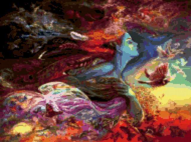 Ориентировочно так, схема вышивки «Abstract», созданная автором Cherry_LudOk, будет выглядеть при отшиве на канве. Размер данной вышивки равен 190x142 крестов, при этом используется 76 цветов. Ключевые слова, по которым можно найти эту схему: абстракция, девушка. Также, вы можете взглянуть на оригинальную картинку, соответствующую данной схеме вышивки.