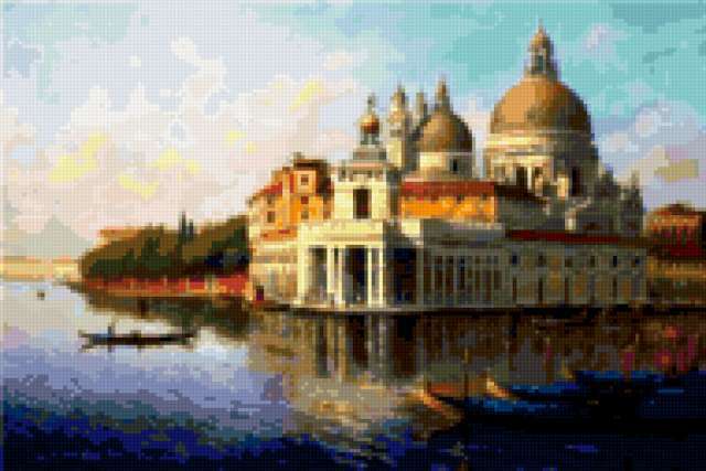 Ориентировочно так, схема вышивки «Adrian Rigby», созданная автором malkinaiv, будет выглядеть при отшиве на канве. Размер данной вышивки равен 190x127 крестов, при этом используется 80 цветов. Ключевые слова, по которым можно найти эту схему: картины, города, дома, каналы, лодки. Также, вы можете взглянуть на оригинальную картинку, соответствующую данной схеме вышивки.