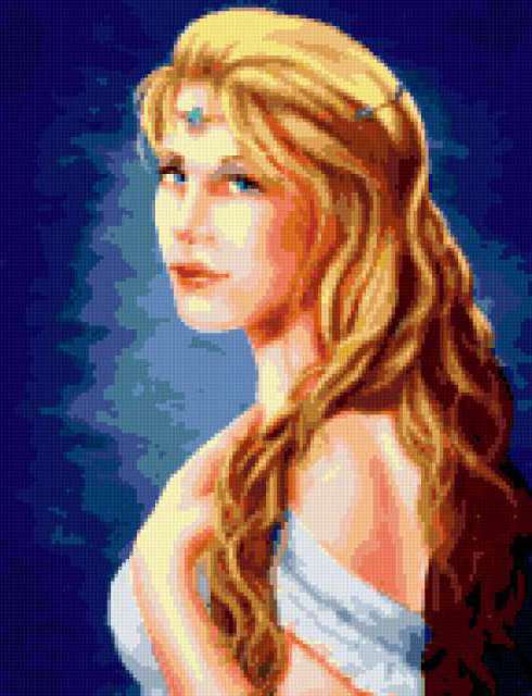 Ориентировочно так, схема вышивки «Afrodita», созданная автором lukrecija12, будет выглядеть при отшиве на канве. Размер данной вышивки равен 144x188 крестов, при этом используется 47 цветов. Ключевые слова, по которым можно найти эту схему: zenshina, boginia. Также, вы можете взглянуть на оригинальную картинку, соответствующую данной схеме вышивки.