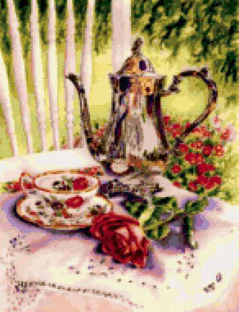 Ориентировочно так, схема вышивки «Afternoon Tea», созданная автором pandreevska, будет выглядеть при отшиве на канве. Размер данной вышивки равен 146x190 крестов, при этом используется 63 цветов. Ключевые слова, по которым можно найти эту схему: still life, натюрморт, atmosphere. Также, вы можете взглянуть на оригинальную картинку, соответствующую данной схеме вышивки.