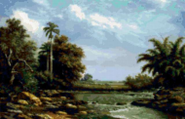 Ориентировочно так, схема вышивки «Alfredo Rodriguez», созданная автором Fardo, будет выглядеть при отшиве на канве. Размер данной вышивки равен 190x122 крестов, при этом используется 64 цветов. Ключевые слова, по которым можно найти эту схему: пейзажи, природа, лето, вода, alfredo rodriguez. Также, вы можете взглянуть на оригинальную картинку, соответствующую данной схеме вышивки.