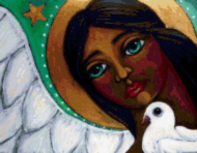 Ориентировочно так, схема вышивки «Angel», созданная автором pandreevska, будет выглядеть при отшиве на канве. Размер данной вышивки равен 190x148 крестов, при этом используется 71 цветов. Ключевые слова, по которым можно найти эту схему: angel, religion, bird, dove. Также, вы можете взглянуть на оригинальную картинку, соответствующую данной схеме вышивки.