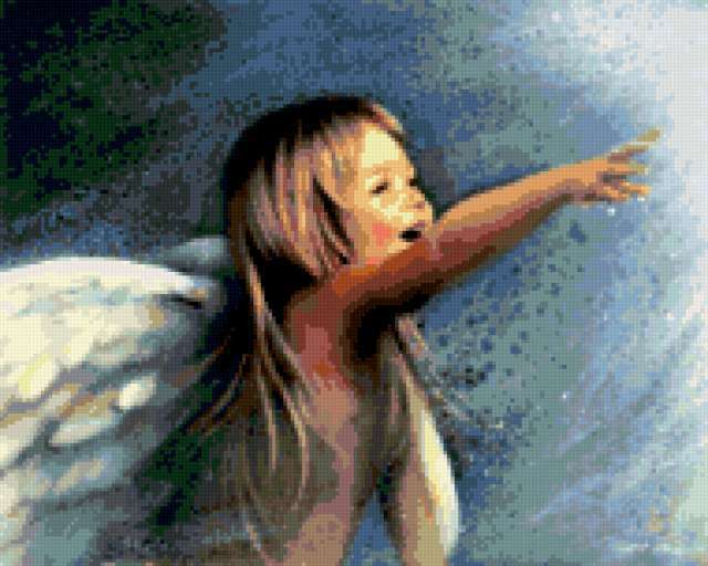 Ориентировочно так, схема вышивки «Angelok», созданная автором lukrecija12, будет выглядеть при отшиве на канве. Размер данной вышивки равен 190x152 крестов, при этом используется 59 цветов. Ключевые слова, по которым можно найти эту схему: deti, rebionok. Также, вы можете взглянуть на оригинальную картинку, соответствующую данной схеме вышивки.