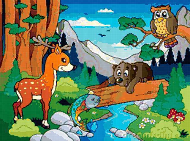 Ориентировочно так, схема вышивки «Animals», созданная автором aniela, будет выглядеть при отшиве на канве. Размер данной вышивки равен 190x141 крестов, при этом используется 70 цветов. Ключевые слова, по которым можно найти эту схему: wildlife, animals, животные. Также, вы можете взглянуть на оригинальную картинку, соответствующую данной схеме вышивки.