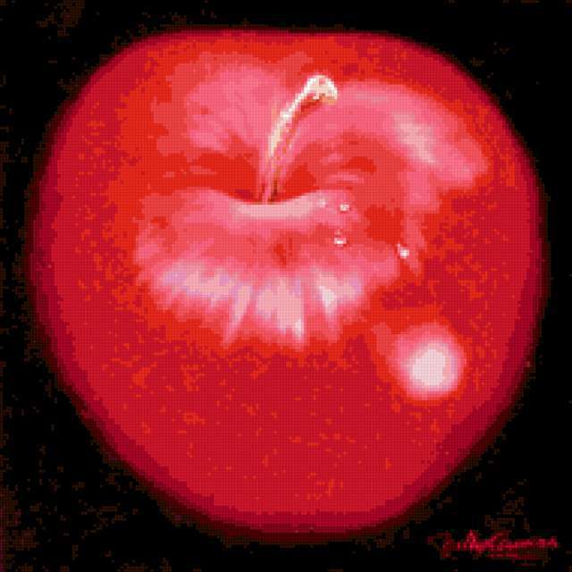 Ориентировочно так, схема вышивки «Apple», созданная автором pandreevska, будет выглядеть при отшиве на канве. Размер данной вышивки равен 190x190 крестов, при этом используется 25 цветов. Ключевые слова, по которым можно найти эту схему: fruits, kitchen, decoration. Также, вы можете взглянуть на оригинальную картинку, соответствующую данной схеме вышивки.